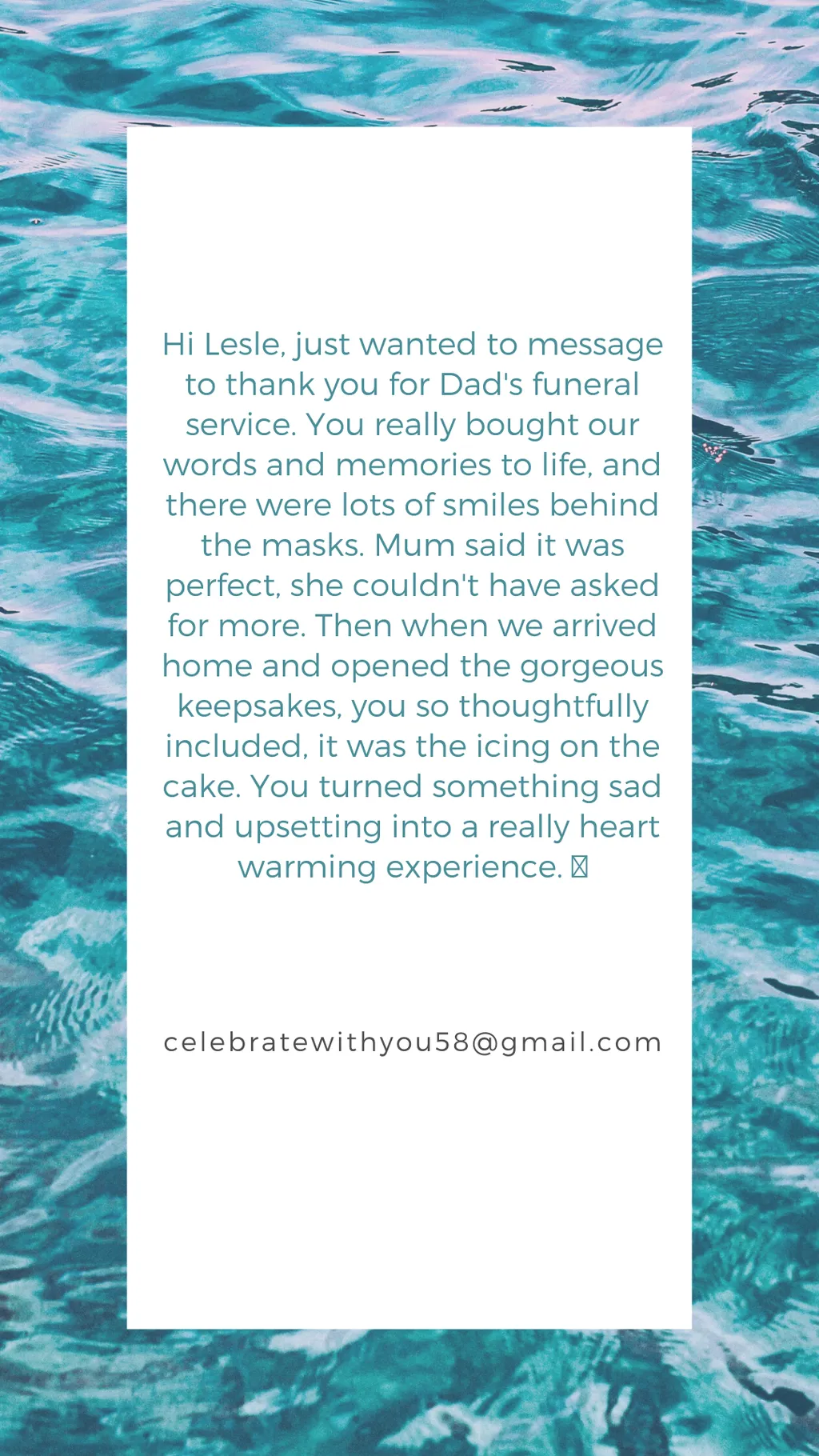 Thank you for all your help with Mum’s funeral. The service was lovely, and so many people commented on how beautifully it reflected her life. You were a huge help in getting me through the tribute